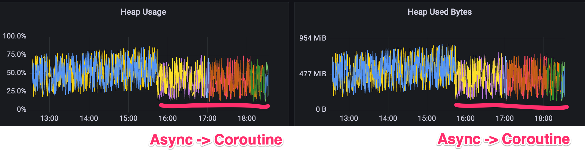 기존에 Spring 의 @Async 를 CustomThreadPool 을 이용해서 사용했었는데, 해당 부분이 엄청나게 빠른 요청이 초당 들어와서 Thread 가 부족해서 비즈니스 요건 상 discard 해도 크게 타격은 없기에 discardPolicy 를 사용하기도 했었다. 요즘 코루틴을 공부하면서 Coroutine 이 얼마나 효율적인지 배우고 있는데 이를 실무에 적용해봤더니 위와 같은 결과가 나왔다. 사실 근데 의문은 Coroutine 은 Continuous 를 Heap 에 담아두고 있는데 왜 Heap 사용량이 오히려 줄었지? 이런 생각이 들었다.