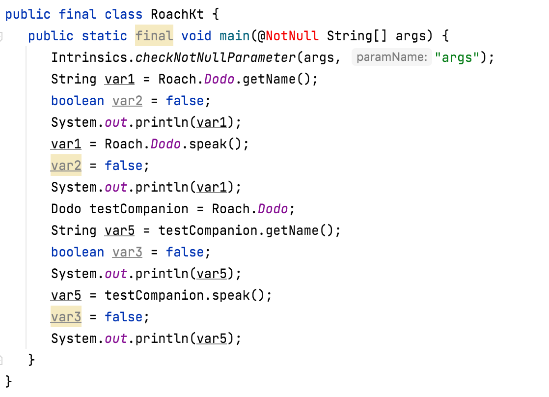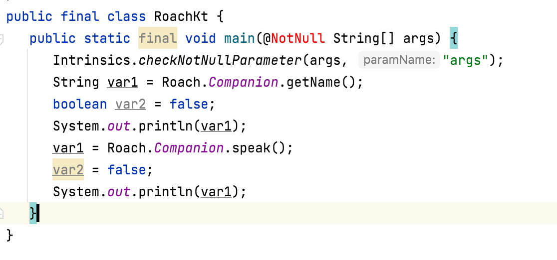 첫번째로는 Roach.Companion 이 companion object instance 를 전달하는 것 같아보인다는 점이다.