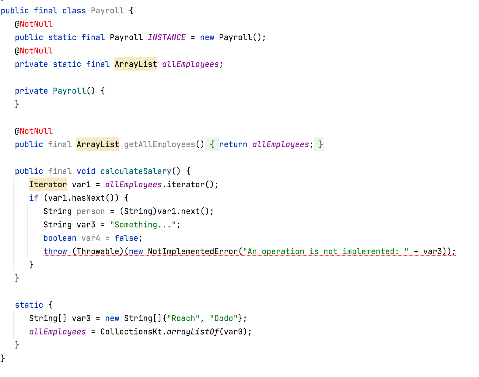 어떻게 Singleton 으로 구현되는 것일까? 컨버팅된 자바코드를 한번보자.