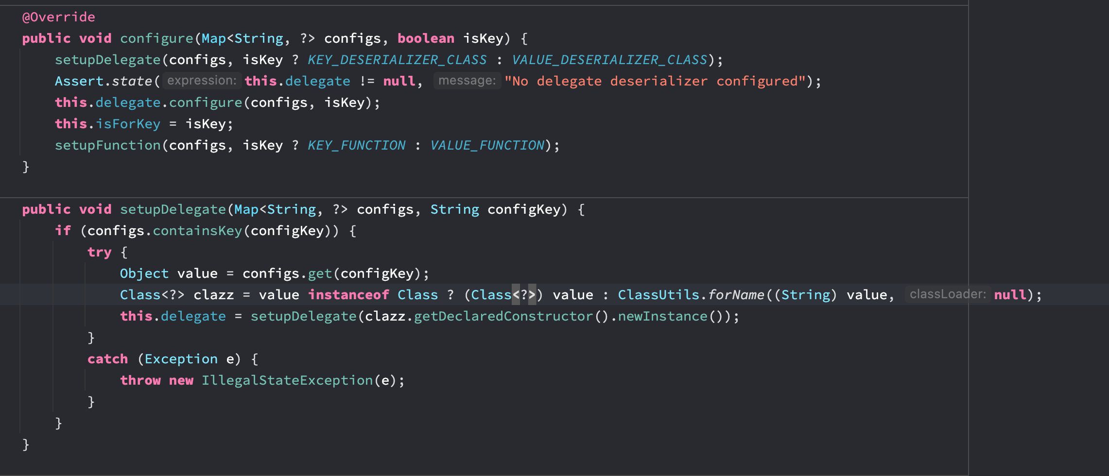 kafka 내부 코드인데 setUpDelegate 를 통해서 내가 설정한 Json, String Deserializer 가 잘 적용되는걸 확인할 수 있었다.