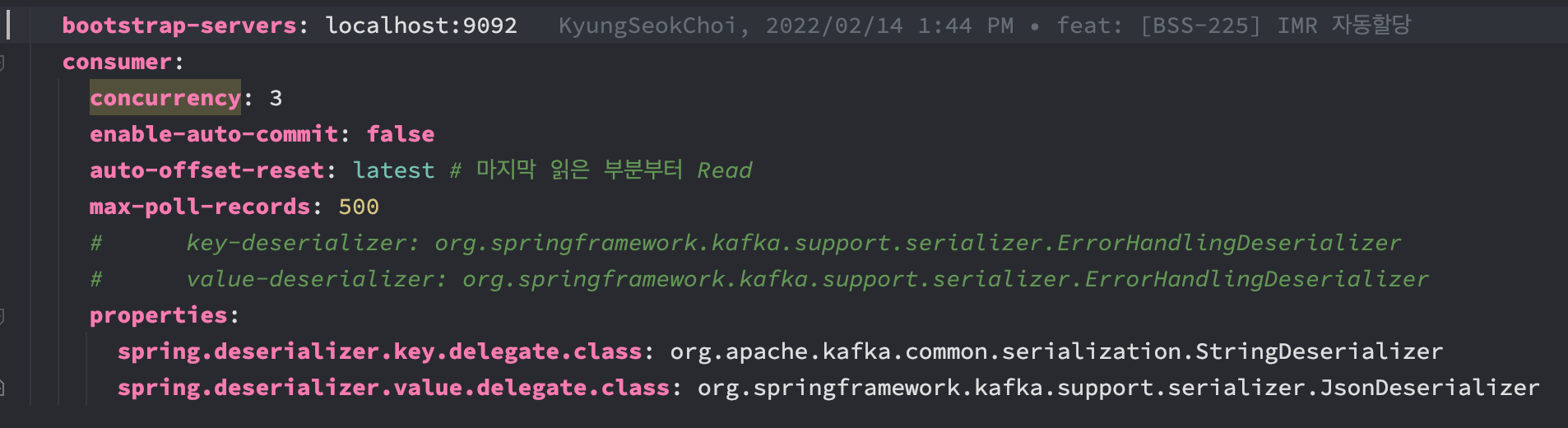 사실 내가 짠 코드가 아니여서 코드를 디버깅 좀 해보다가 처음에는 KafkaRecord 에 자꾸 코드에서 DeserializerException 을 넣길래 아니 이게 key-value deserializer 가 잘못되어 있는거 아니야? 하고 빼고 하니깐