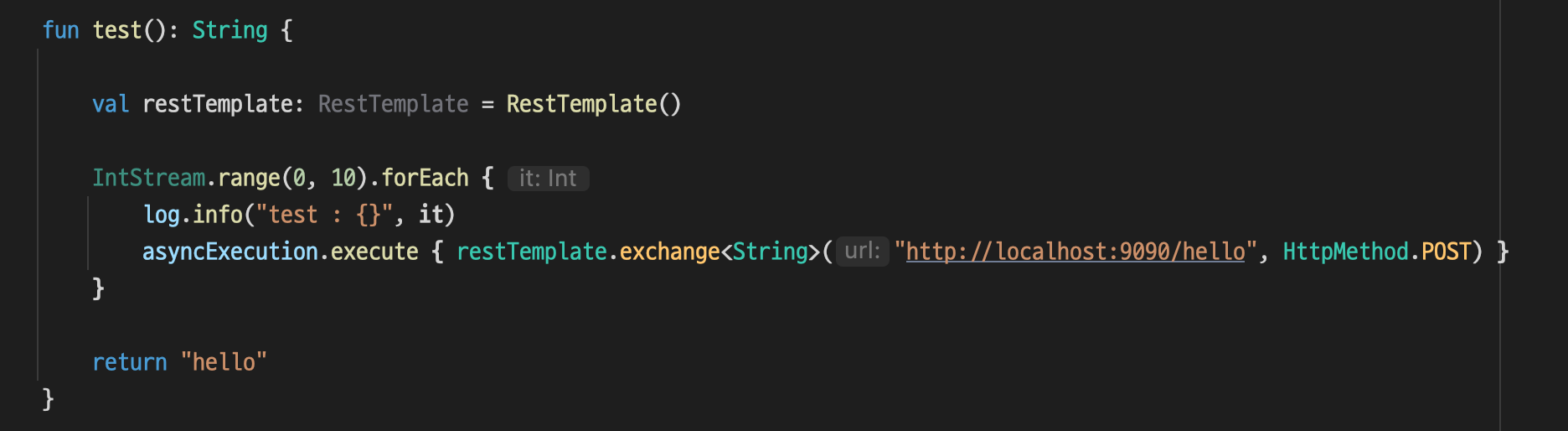 위의 클래스 두개를 만들어놓자. 하나는 Async 로 FunctionTemplate 을 돌릴거고, 하나는 Sync 로 FunctionTemplate 을 수행할 것이다. 나의 다른 서비스로 한번 요청을 보내보자.