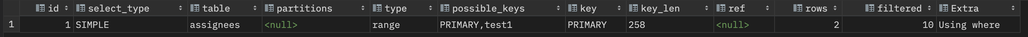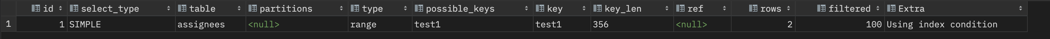 test1 은 현재 자주사용하는 쿼리에 맞게 인덱스를 구성했는데, PRIMARY 인덱스를 사용해서 현재 filtered 가 10 밖에 나오지 않는다. 인덱스를 구성할때 test1 인덱스를 사용하여 filtered 가 100 이 되는게 내 목표였다. 그래서 SELECT Query 를 질의할때 Hint 를 사용해주었다. Hint 는 아래와 같이 사용하면 된다.