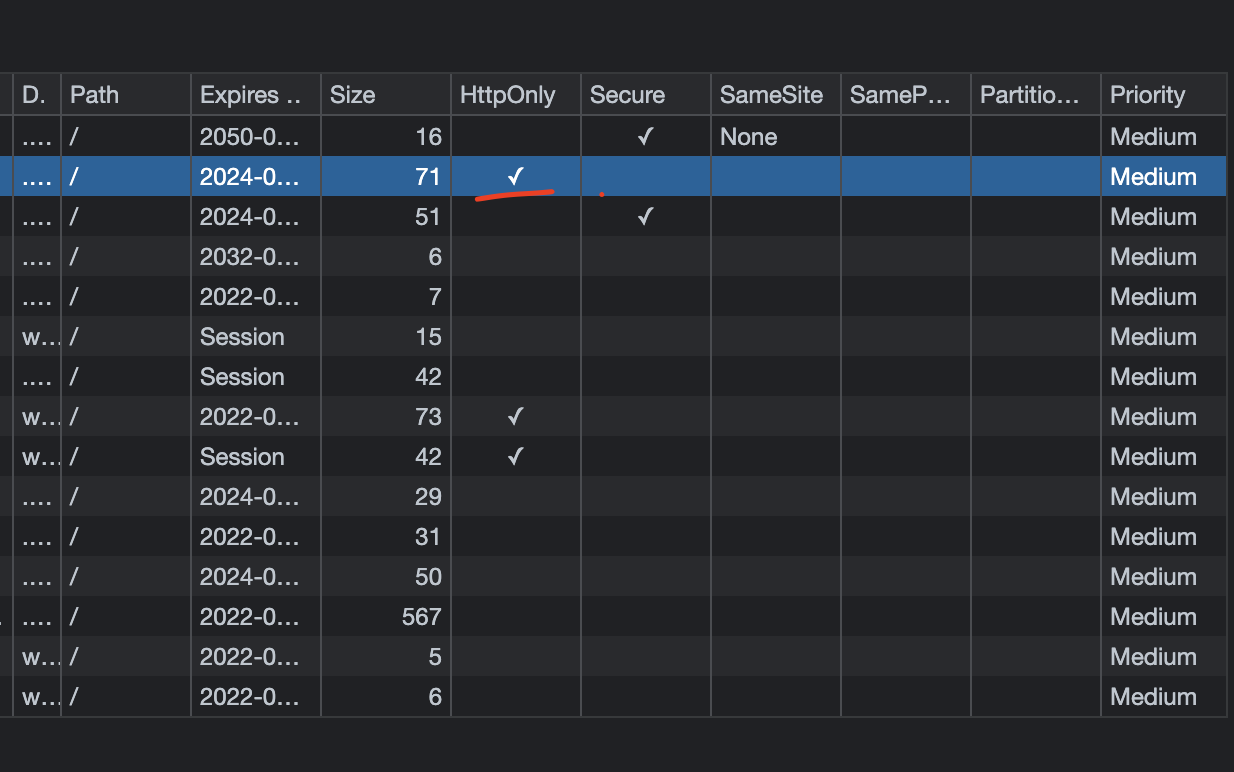 그래서 사용자의 쿠키를 탈취하기 위한 여러가지 방법들이 시도 됬는데, 그 중 하나가 XSS 이다. 자바스크립트 코드를 이용해 사용자의 쿠키를 공격자의 컴퓨터로 보내, 공격자는 해당 쿠키를 이용하여 웹 싸이트에서 해당 사용자인것처럼 행동할 수 있게 되는 것이다. 이러한 자바스크립트를 통한 공격을 막기 위해서 httpOnly 라는 값이 생기게 되었다. 브라우저에 저장된 네이버의 쿠키를 보면 httpOnly 옵션이 있다.