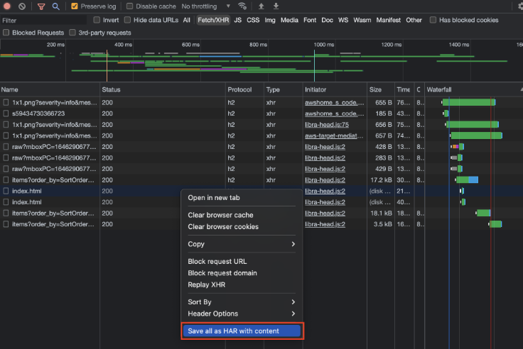 4. 재현한 후에 네트워크 탭에서 "Save all as Har with content" 를 눌러서 파일을 저장해주세요.