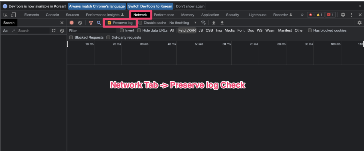 3. 기록을 다 지웠다면 버그가 났던 상황을 똑같이 재현합니다. 개발자도구를 닫지 말고 재현해주세요.