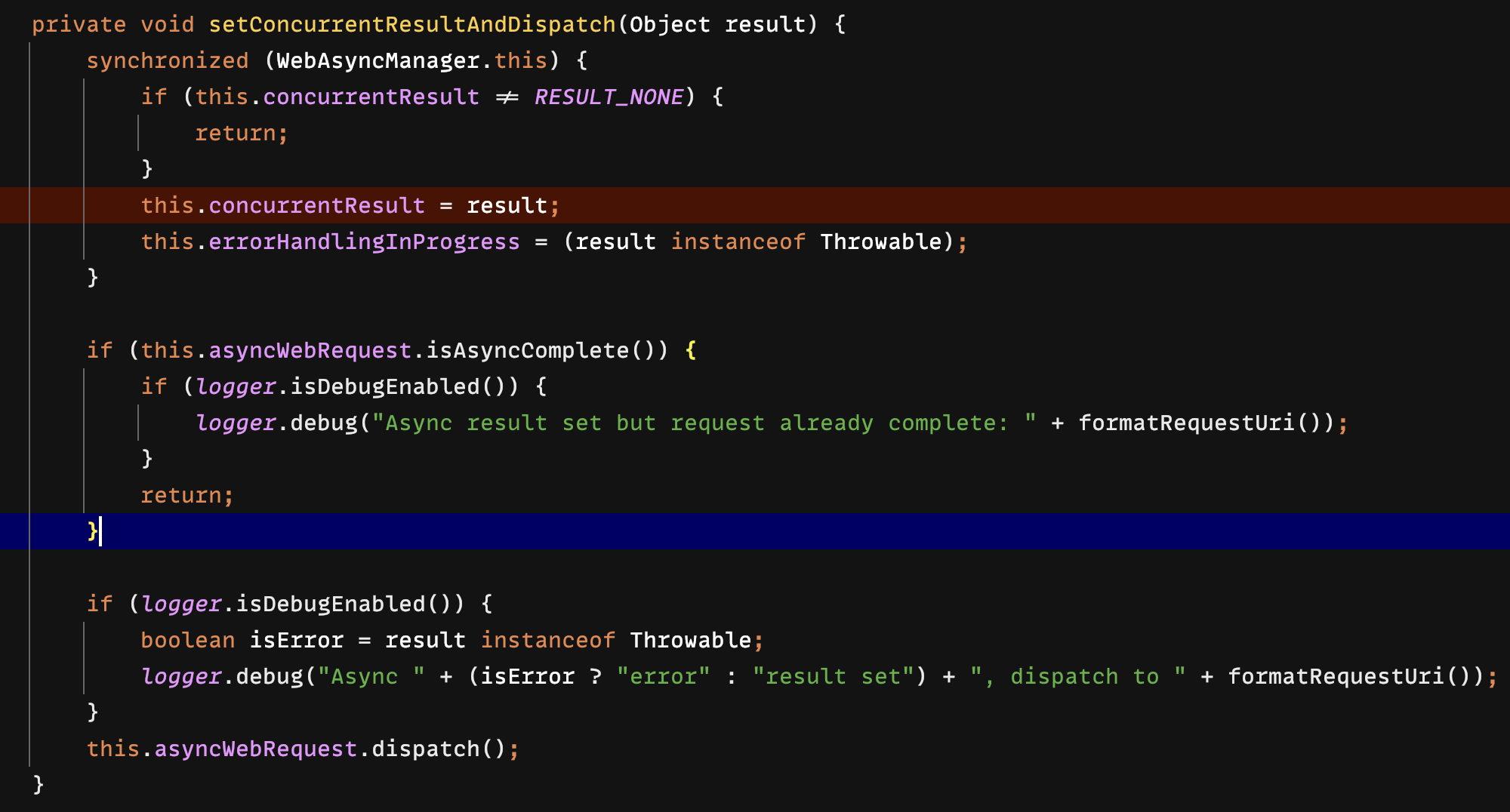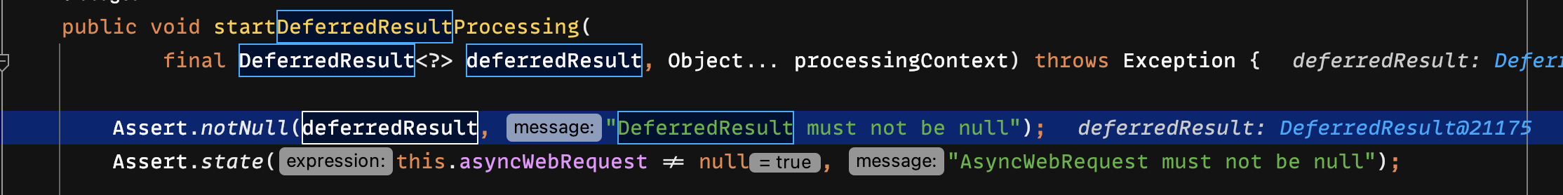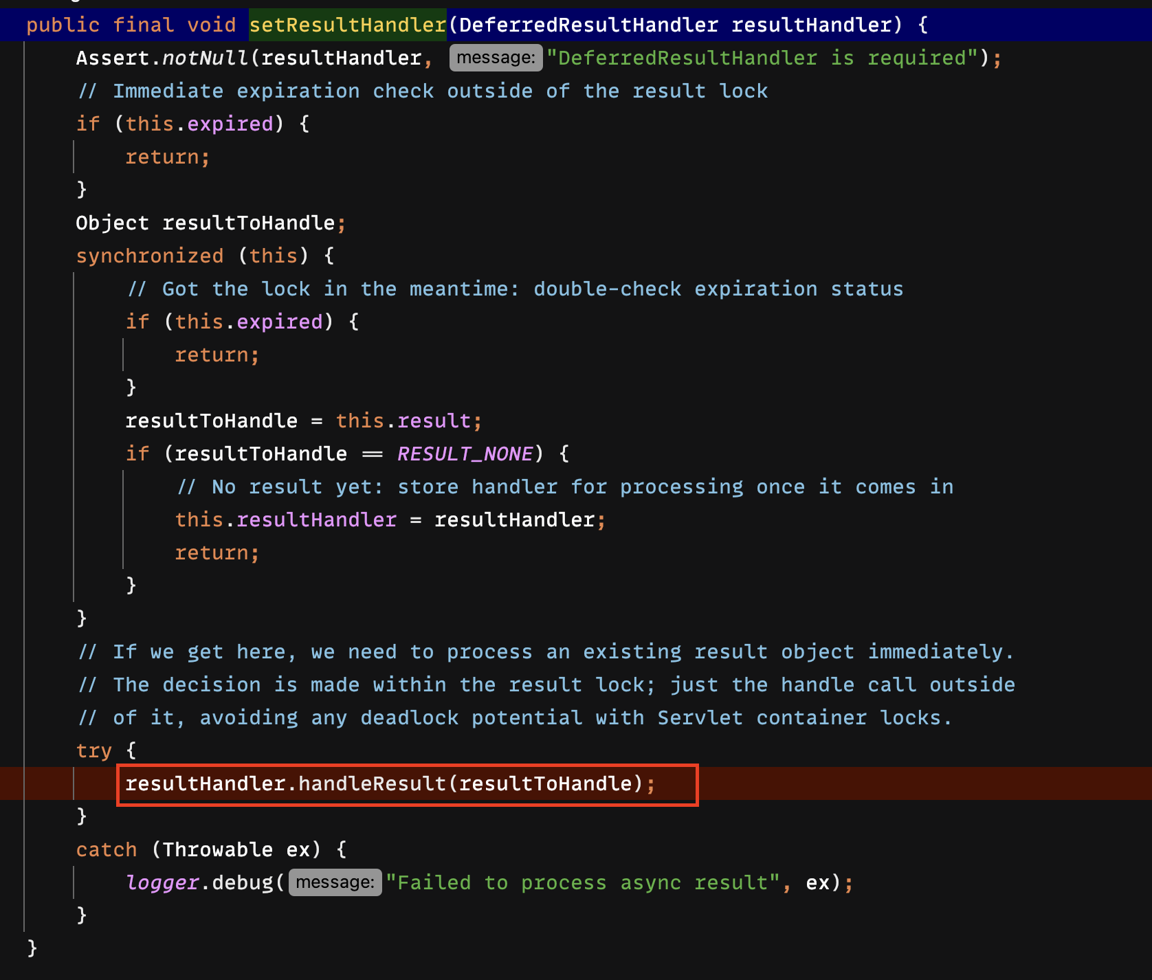 결국 하단에서 DefferedResult 가 되고 DefferedResult 를 가공하는 Method 인 startDefferedResultProcessing 이 시작된다.