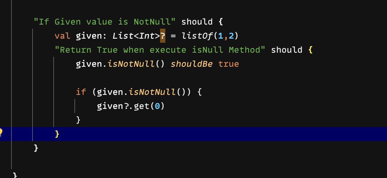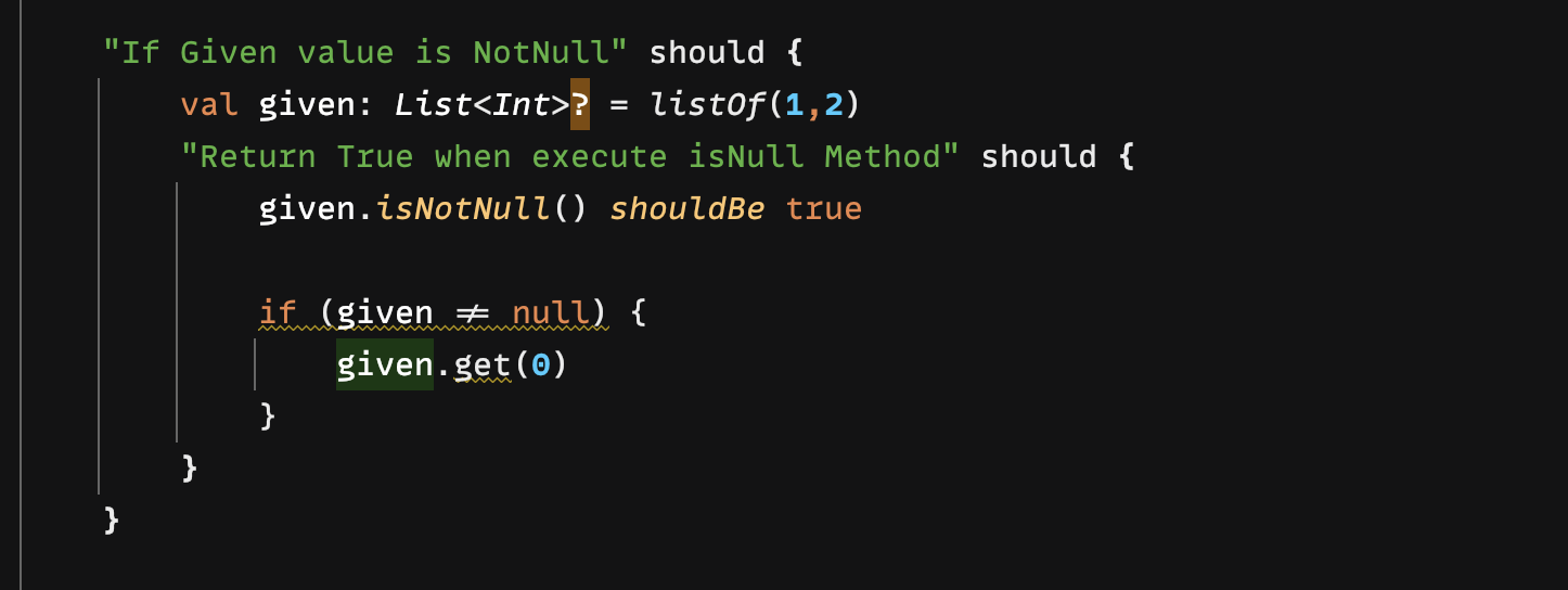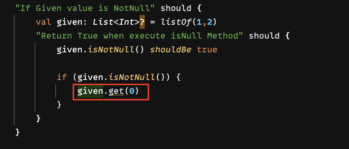 분명 isNotNull 이라는 제가만든 커스텀 확장함수로 NullCheck 를 함에도 불구하고 아래와 같이 `?(safe-null)` 을 써야만 하는 상황입니다. 이 상황은 왜 발생할까요? Kotlin 의 SmartCast 는 쉽게 얘기해서 컴파일러(Compiler) 가 Programmer 대신에 Casting 을 Smart 해주게 하는 기능을 뜻합니다. 즉, 위 코드가 SmartCasting 이 안되는 이유는 컴파일러에게 `given` 이라는 variable 이 not null 이라는 것이 전달되지 않았기 때문입니다.