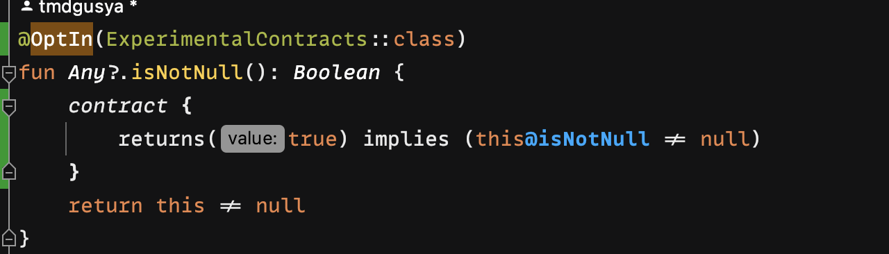 위와 같이 코드를 변경해주면 되는데요. 쉽게 예기해서 "현재 객체가 null 이 아닐경우 true 를 리턴할꺼야" 라고 컴파일러에게 얘기해주는 코드입니다. 해당 기능은 실험적인 기능임으로, @OptIn(ExperimentalContracts::class) 을 명시해주어야 합니다.