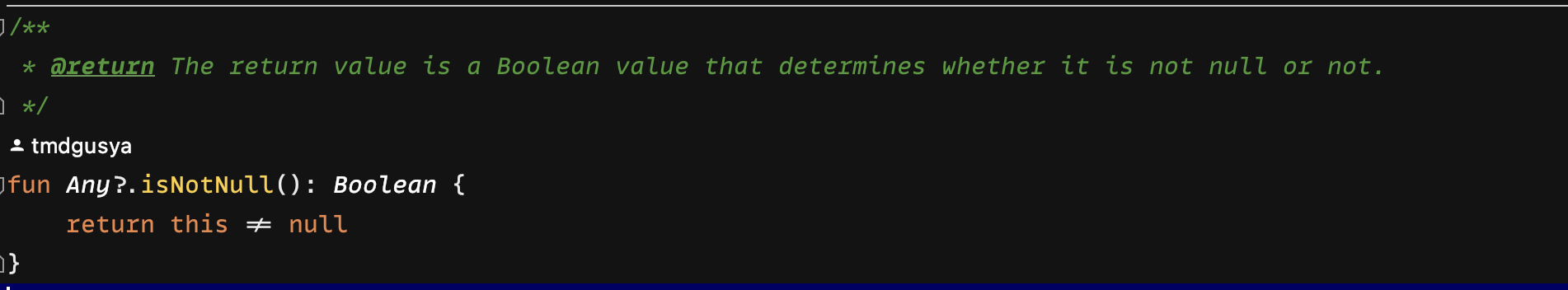 위와 같은 문제로 인해서 Kotlin 1.3 에서는 Contract 라는 개념을 도입했습니다. Contract 는 Compiler 에게 어떤 행위에 대한 결과값이 trusy 한지 falsy 한지를 알려주어 Smartcast 를 가능하도록 하는 기능인데요. 아까의 코드를 보면 조금 더 이해가 쉬우니, 아까의 코드에서 isNotNull() 의 구현체 부분을 다시 보도록 합시다.