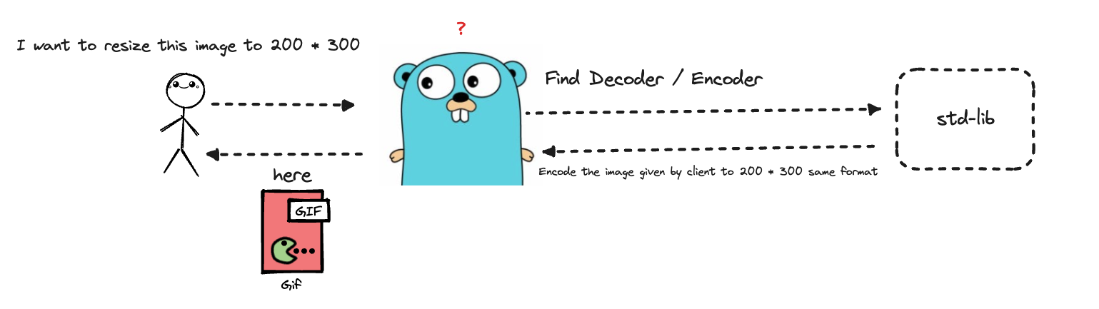 사용자가 CLI 를 통해 우리가 Go lang 으로 만든 어플리케이션에게 요청을 보내면 Go lang 이 내부 Standard Library 를 이용해 맞는 Encoder / Decoder 를 찾아 요구하는 사양을 갖춘 새로운 이미지의 형태로 이미지를 생성하여 클라이언트에게 돌려주는 형식입니다.