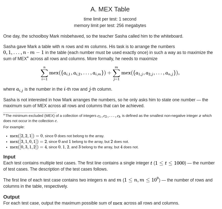 코드포스에서 쉬운 문제중 하나인 Mex Table 이 문제는 풀기 쉬운편에 속한다. 일단 문제를 풀기 위해 MEX 함수에 대해 이해하는 시간을 가져보자. MEX 함수는 0을 포함한 음이 아닌 정수중 collection 에 나열되지 않은 가장 최솟값을 뜻한다. 예를 들면, 아래식은 반드시 0의 값을 가진다.