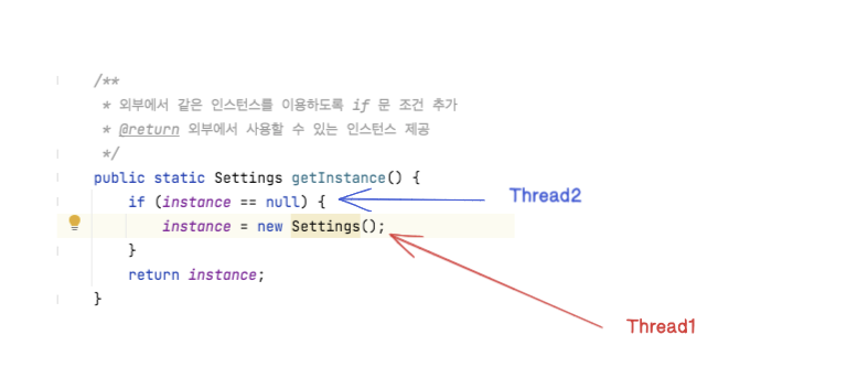 Thread 1 번이 인스턴스를 만들고 있을때 Thread 2 번이 저 조건문에 들어가게 되면 어떻게 될까요?