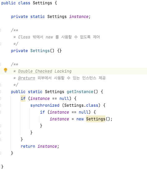 요건 이제 인스턴스가 생성되고 나서는 synchronized 에 접근하지 않을 것이므로 처음 것보다는 훨씬 병목현상이 적을 수 밖에 없다.