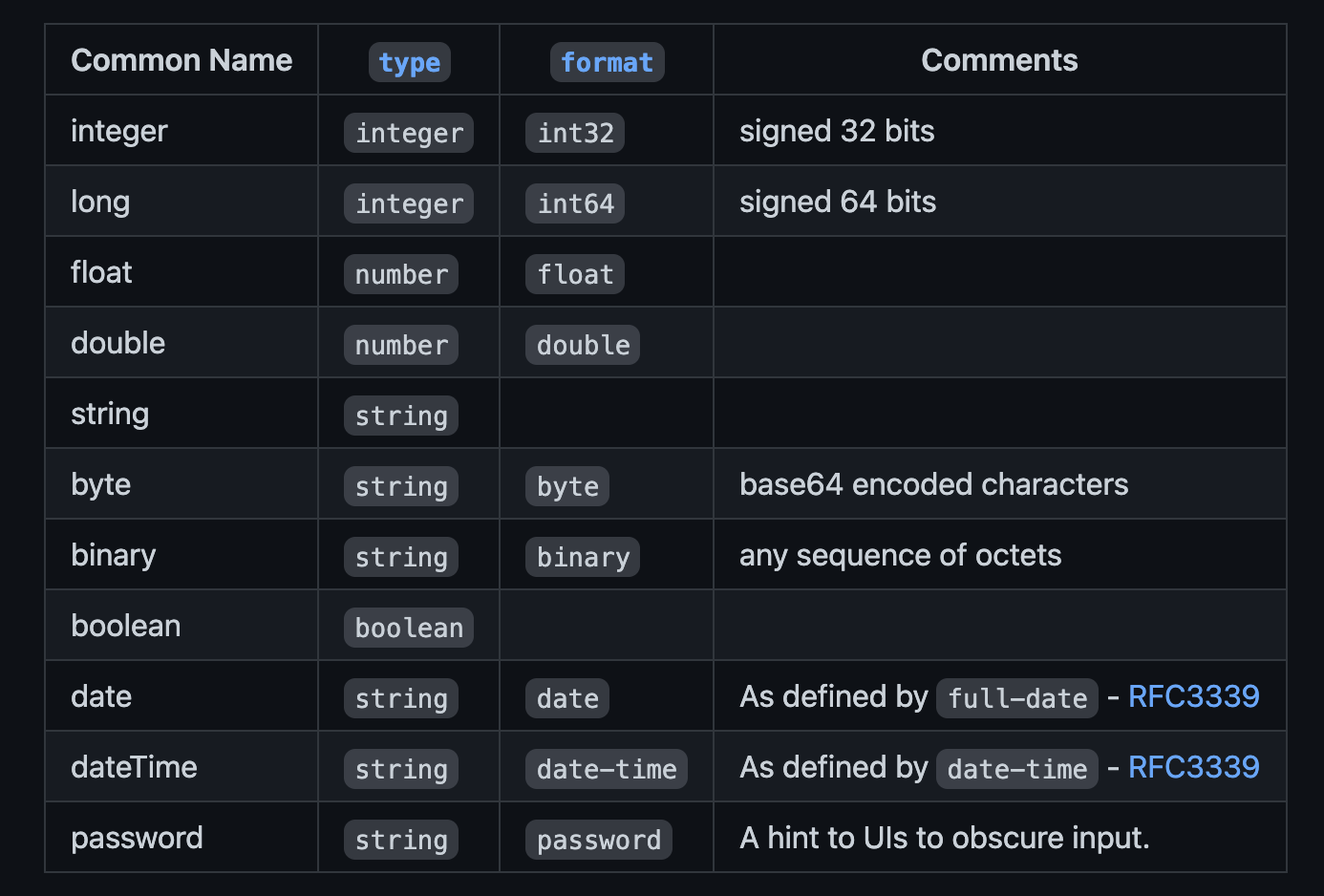 OPEN API 3.0 규격에서 지원해주는 데이터 타입은 정해져 있습니다.