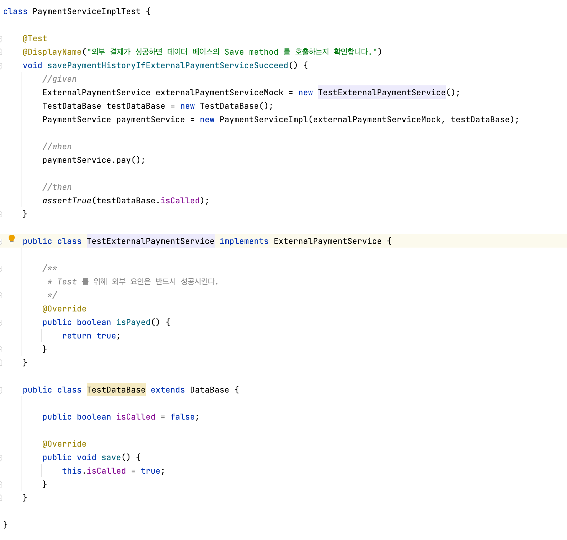위와 같이 테스트 더블을 하면 외부 결제는 반드시 성공한다는 조건으로 테스트가 가능할 것 이다.