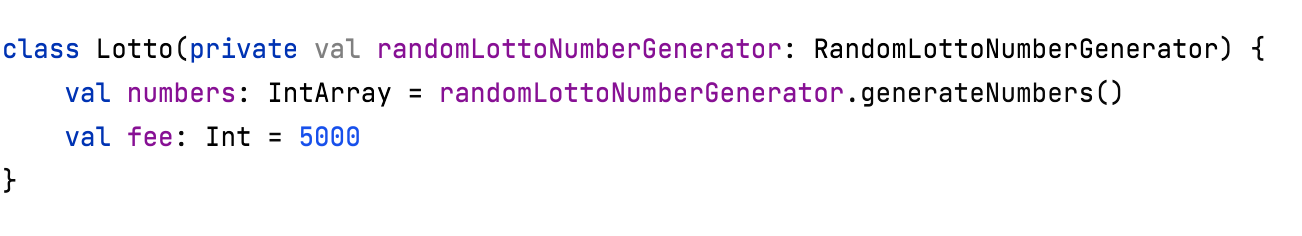 Lotto Class 는 자신의 IntArray 를 랜덤 숫자로 채우기 위해서 randomLottoNumberGenerator 에 협력을 요청하고 있다.