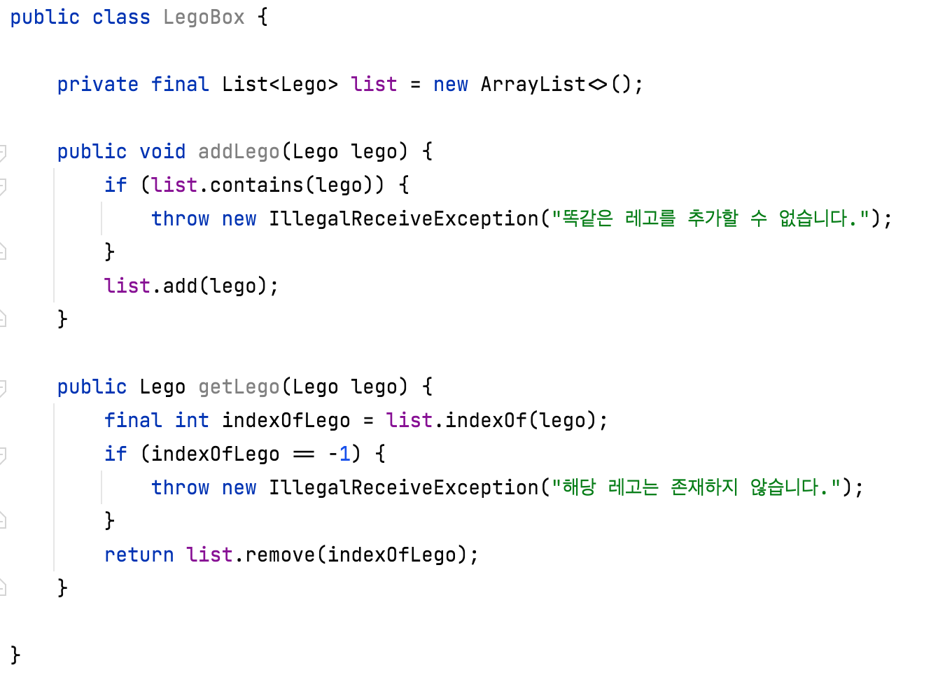 LegoBox 는 Lego 를 List 형태의 자료구조에 넣으며 관리하기 위해 생성된 1급 콜렉션 객체이다.