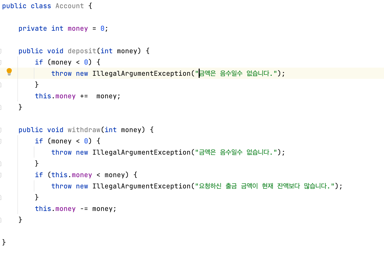 전통적으로 프로그래밍을 안전하게 하기 위해서는 예외를 Throw 하는 쪽을 조건문 안에 넣는 것이 좋다.