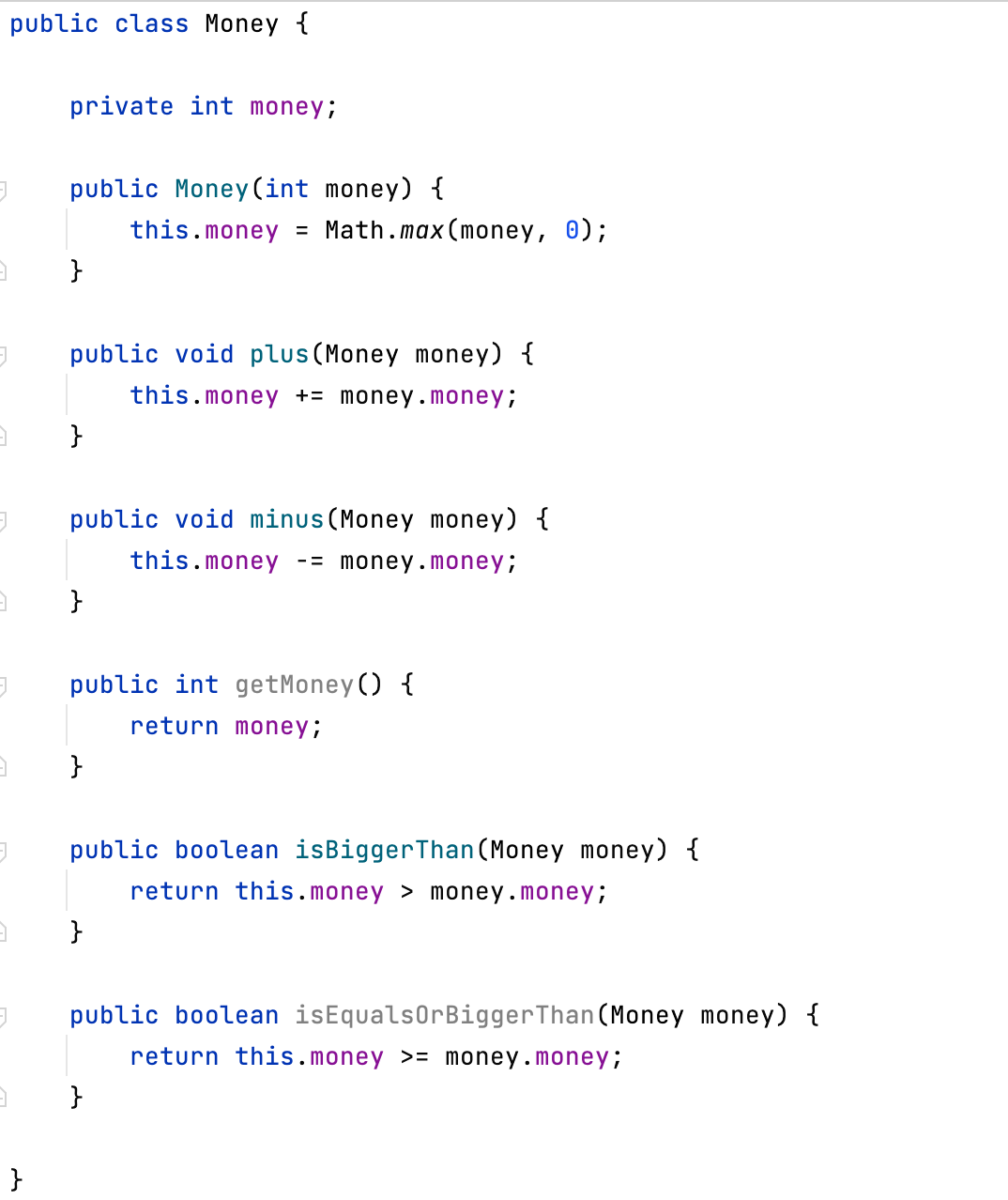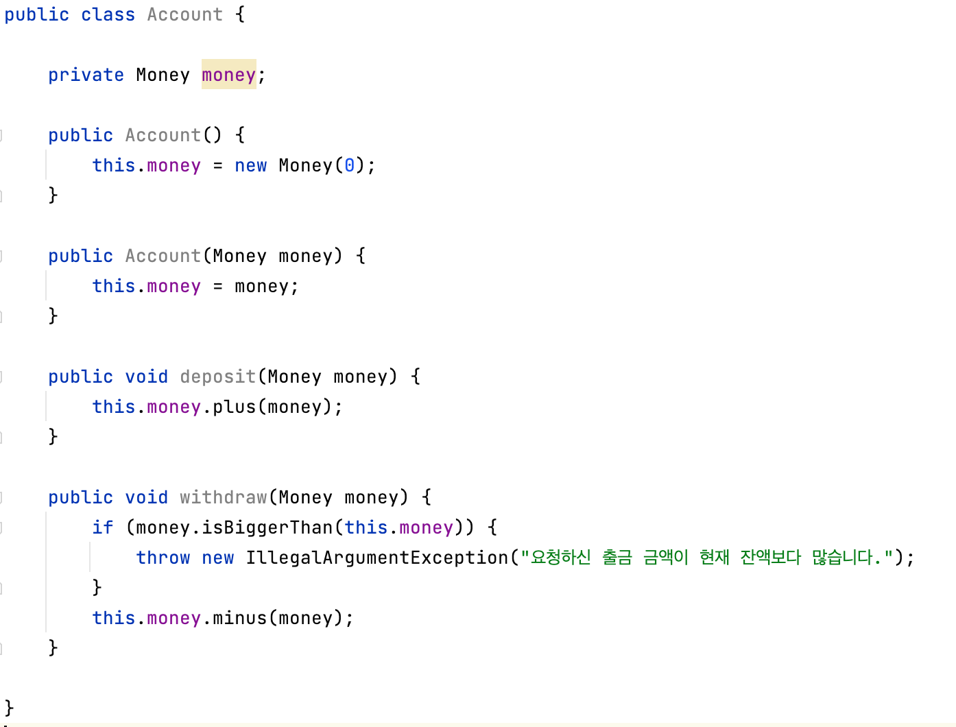 일단 Money 객체를 Wrapping 해서 생성자를 사용할때 money 에 무조건 양수값을 넣어야만 작동한다.