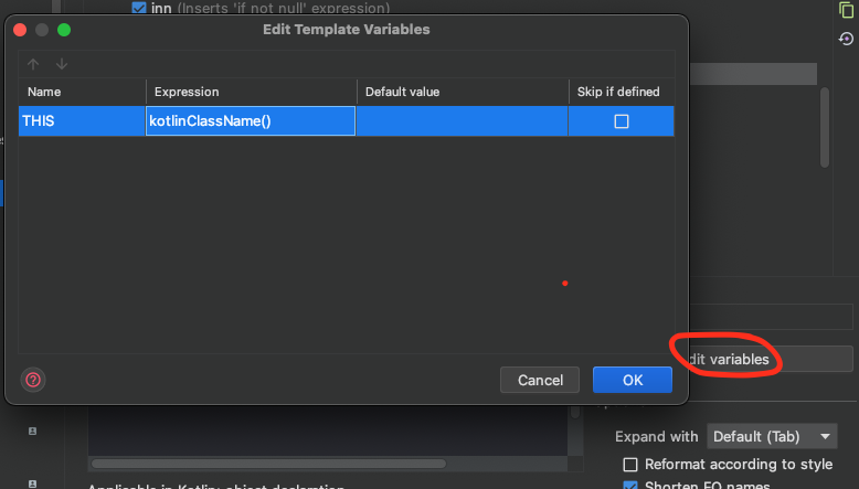 $THIS$ 에는 현재 클래스 이름을 입력해야 하므로 Intellij 의 변수 기능을 이용합니다.