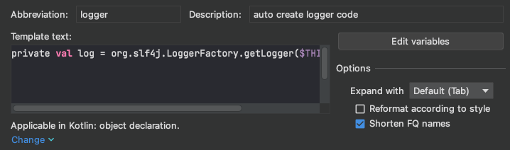 이제 위의 반복됬던 로거를 한번 Live Template 으로 만들어봅시다.