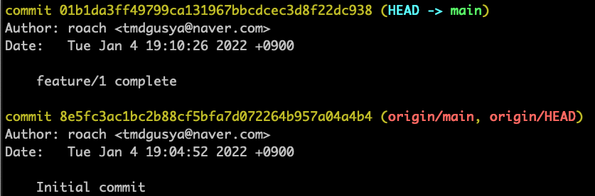 아래 과정을 진행하고 나면 commit message 를 입력하는 창이 나오는데 이때 feature/1 complete 라고 적어보자.