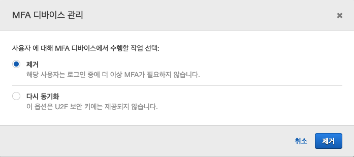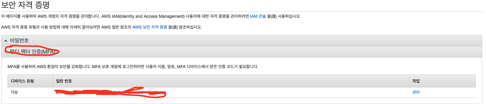 이제 저 MFA 를 제거해주기 위해서 작업(관리) 를 누르자.