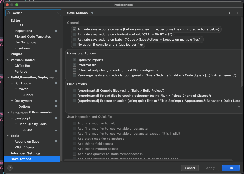 일단 Preference(설정) - Plugin 에서 Save Actions 를 설치해줍니다.