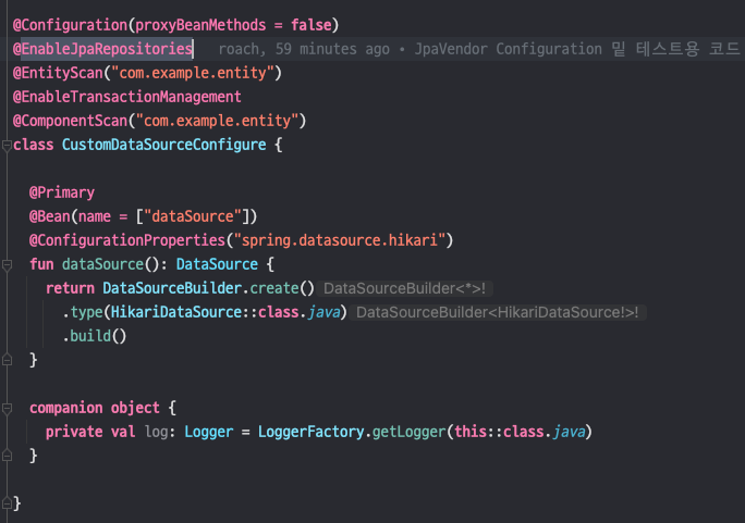 Spring Bean 은 분명 Singleton 으로 관리되서 DataSource 나 EntityManager Configuration 값을 동일하게 가질 텐데 왜 Entity 에서 설정해준 Bean 을 사용하지 않지..? 근데 분명 Spring Logging 을 보면 Hibernate Datasource 를 두번 만들지는 않는 것 처럼 보인다.