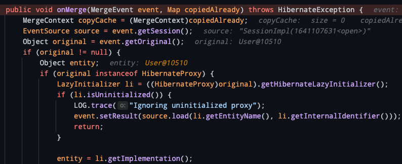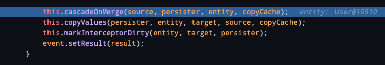 Merge 과정 중에 DirtyInterceptor 마크를 남겨라.. 라는 등의 메소드 등도 볼 수 있다.