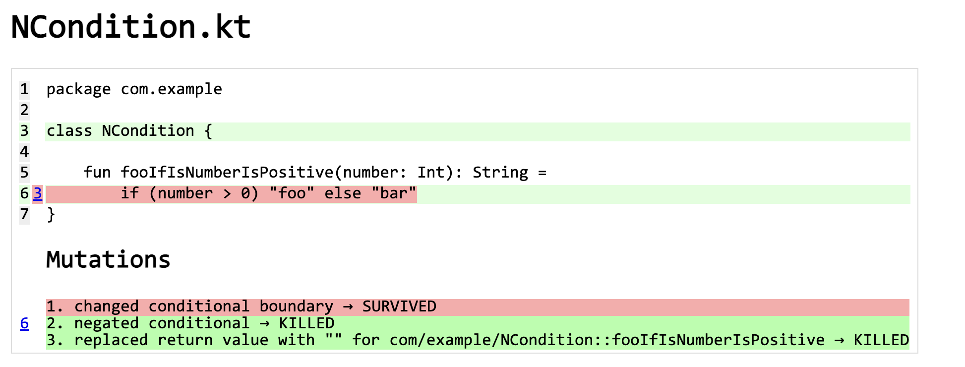 돌연변이 세명 중 `changed conditional bundary` 를 마주했을 것이다. 우리의 조건은 `>` 에서 `>=` 으로 변경되었을 것이고, 그렇게 되면 당연하게도 0 일 경우 기존에는 "bar" 를 반환했지만, "foo" 를 리턴하는 변화(Change)가 생길것이다. 즉, 우리의 코드는 현재 0 일경우에 대한 케이스 및 반대 케이스에 대한 테스트 케이스가 존재하지 않는다.