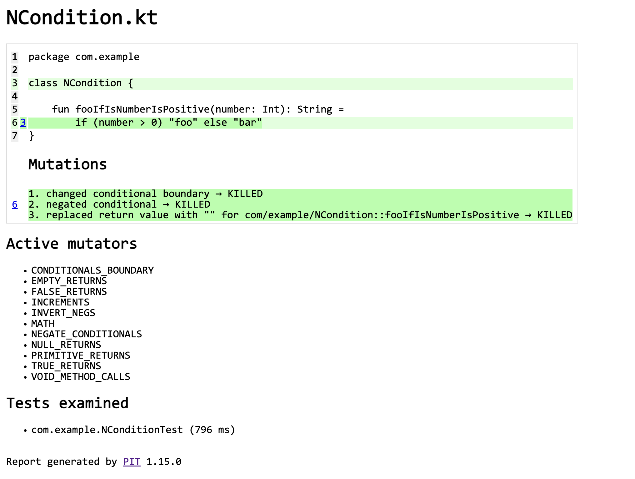 만약 로치가 위와 같이 케이스 작성하고 "양수일때와 음수일때 케이스를 잘 확인하고 있다" 하고 퇴근하려고 생각했다고 가정해보자. 로치는 가기전 마지막으로 현재의 테스트 케이스가 변화를 잘 감지하는지 확인하기 위해 PiTest 를 돌려보았다. PiTest 를 돌려보니 결과는 아래와 같았다.
